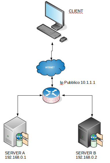 Analizziamo il caso in cui il client attraverso la rete internet, voglia accedere alla pagina web che risponde alla porta 8080 sul SERVER A con ip privato 192.168.0.1. Di questa pagina abbiamo una copia perfetta sul SERVER B con ip privato 192.168.0.2 che risponde sulla porta 80.